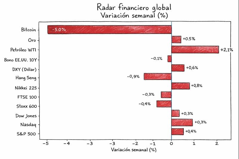 Bitcoin corrige cerca de un 5 % semanal y se mantiene alrededor de niveles clave (~88–90 mil USD), actuando como termómetro de menor apetito por riesgo en activos más volátiles.