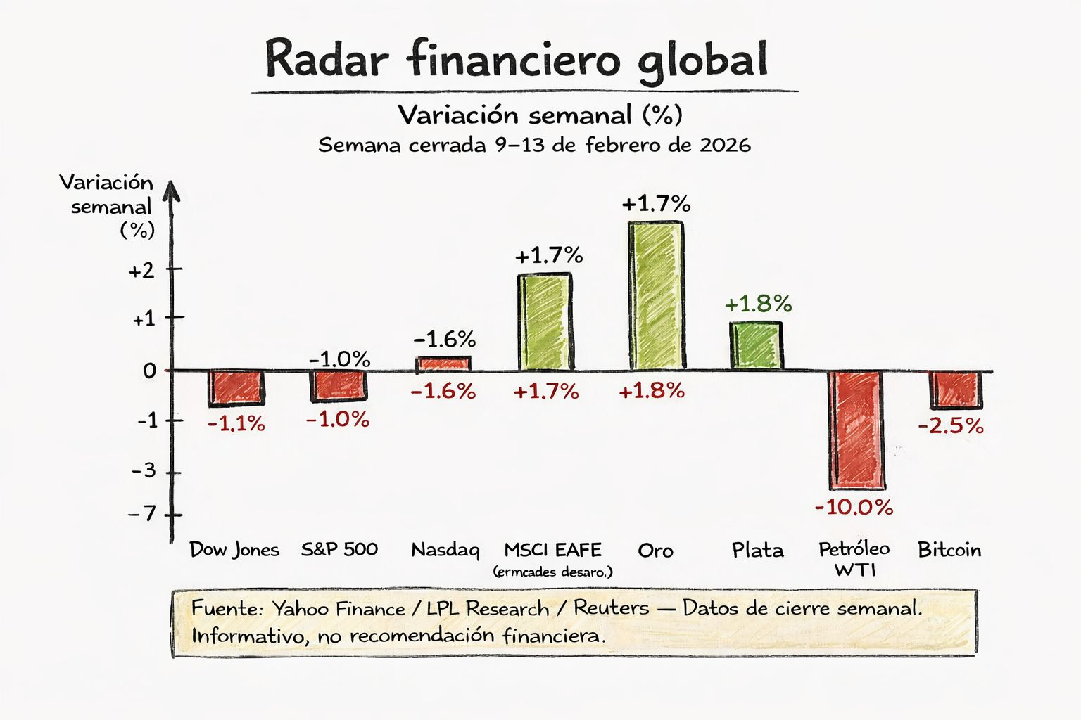 Los tres grandes índices —Dow, S&P 500 y Nasdaq— terminaron la semana con caídas, siendo el Nasdaq el más afectado por preocupaciones de disrupción tecnológica.